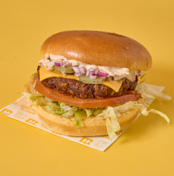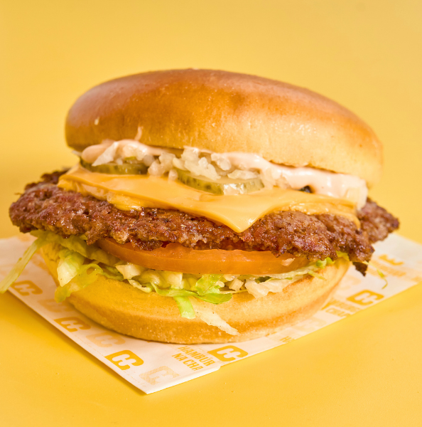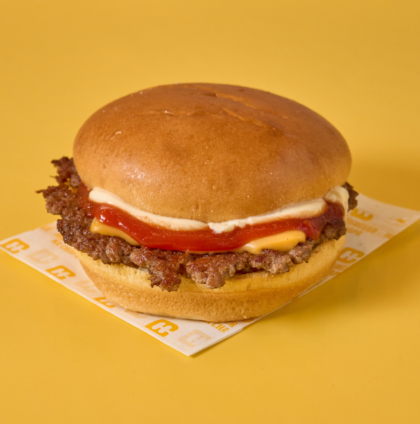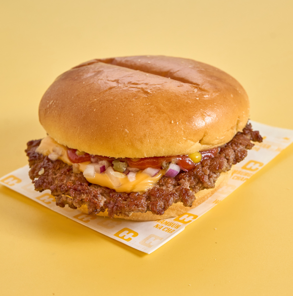 Hambúrguer de vaca ou frango, queijo cheddar, maionese e ketchup. Inclui batatas fritas pequenas e sumo de mistura Bongo.