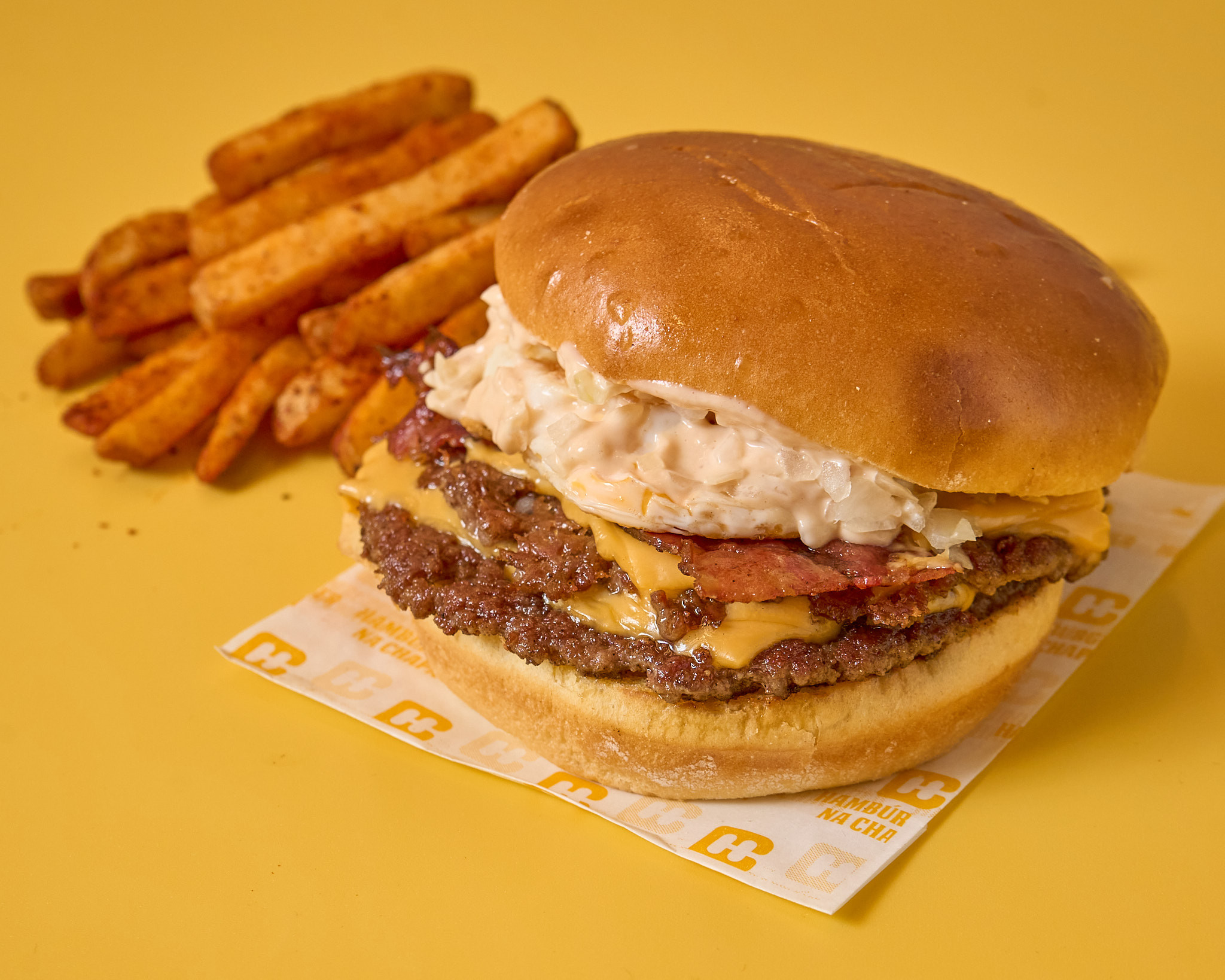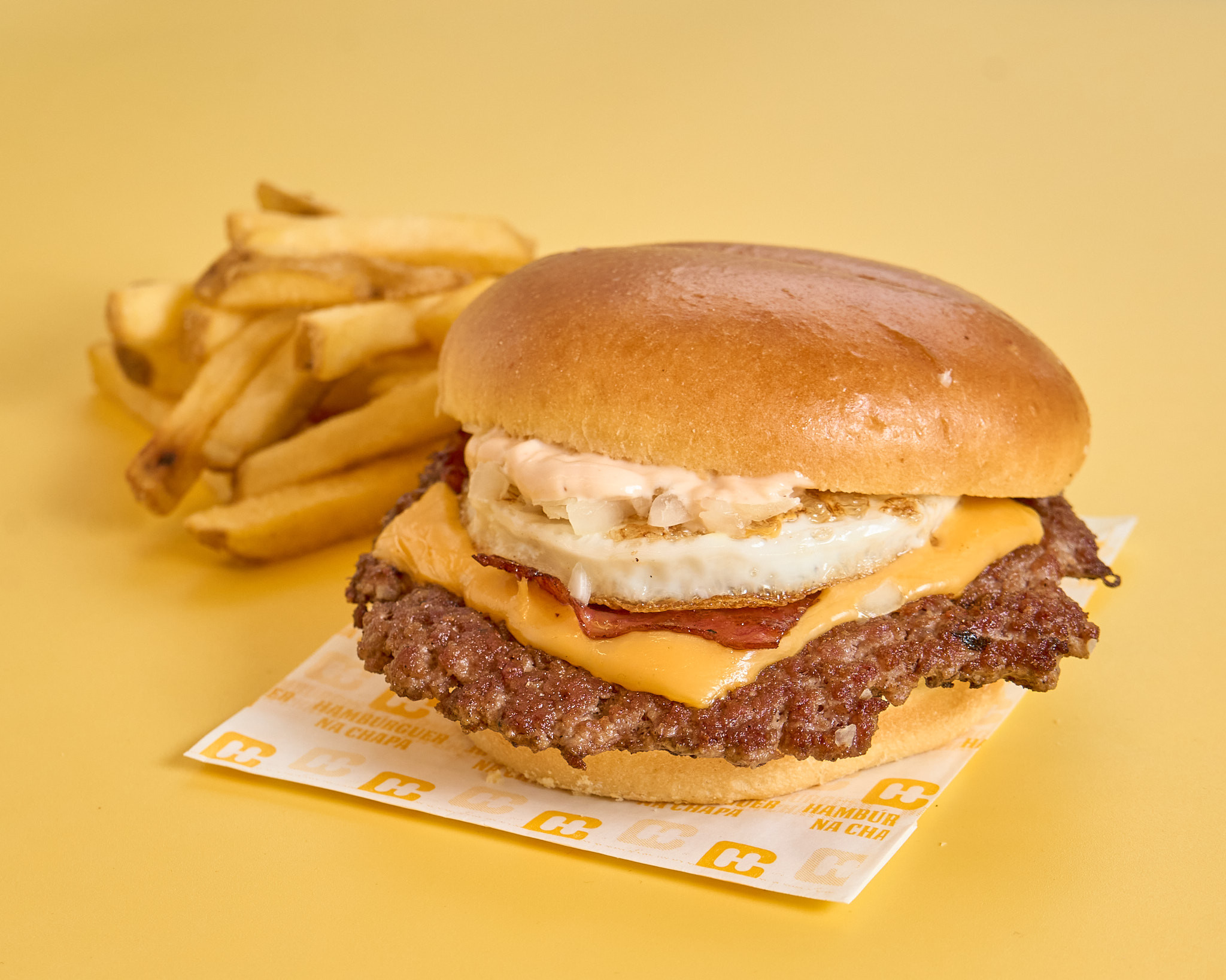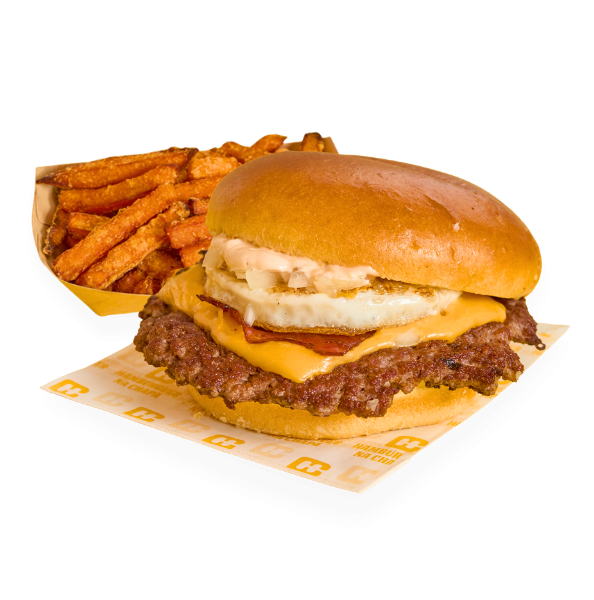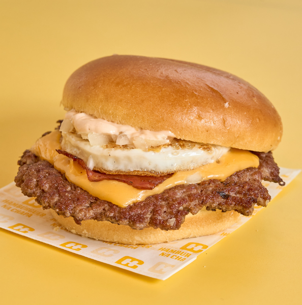 Pão brioche, smashburger (apróx. 190gr), queijo cheddar, ovo estrelado, bacon grelhado, cebola