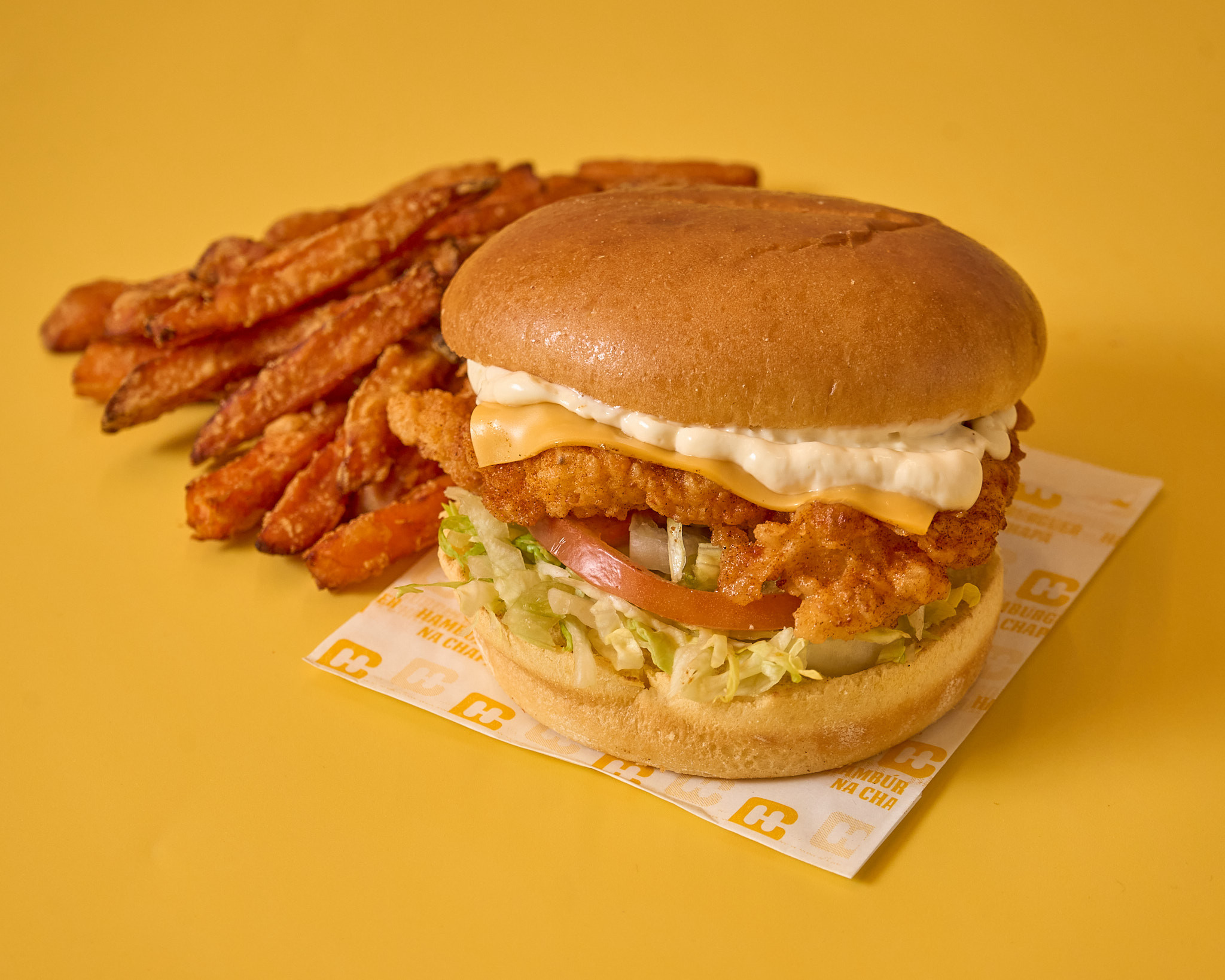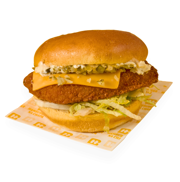 Pão brioche, filete de pescada panado, molho tártaro, alface, pickles e cheddar.
