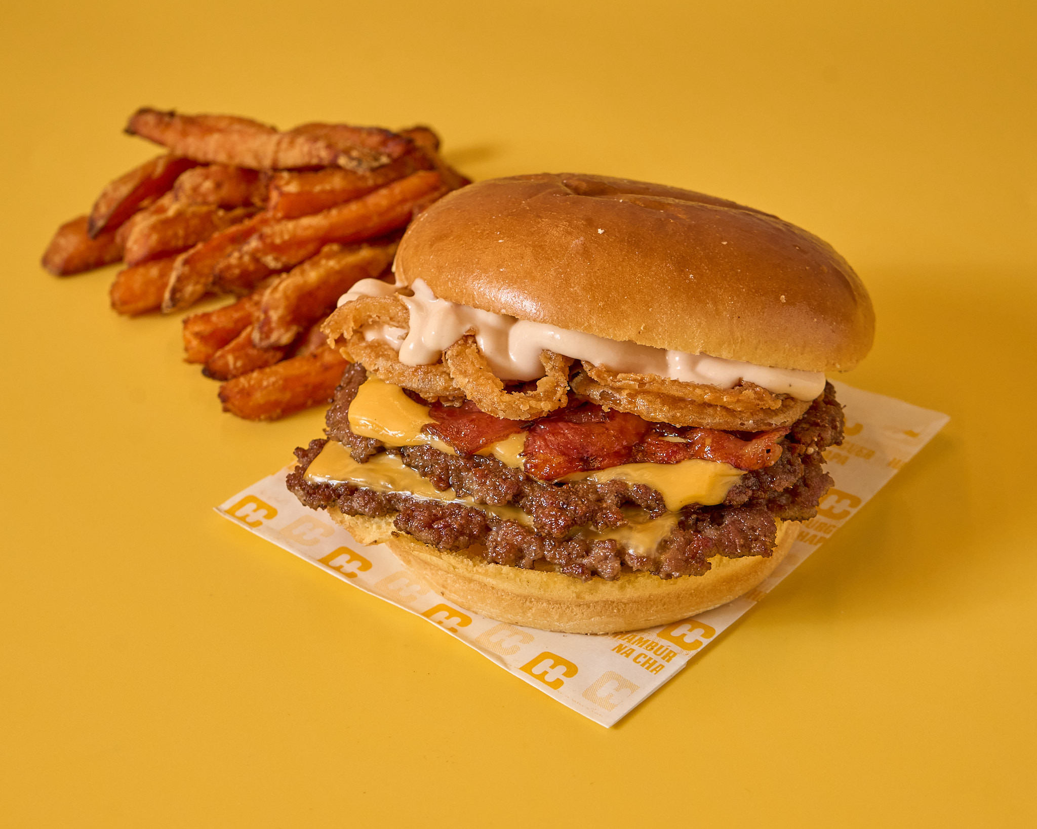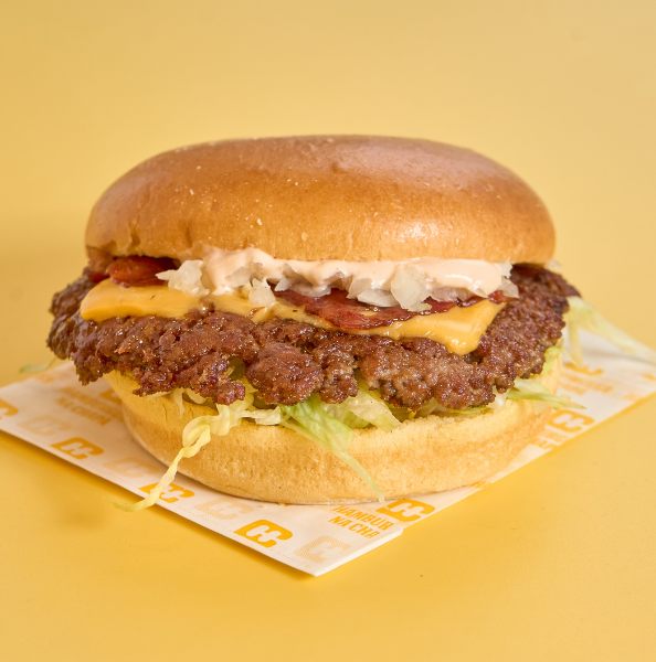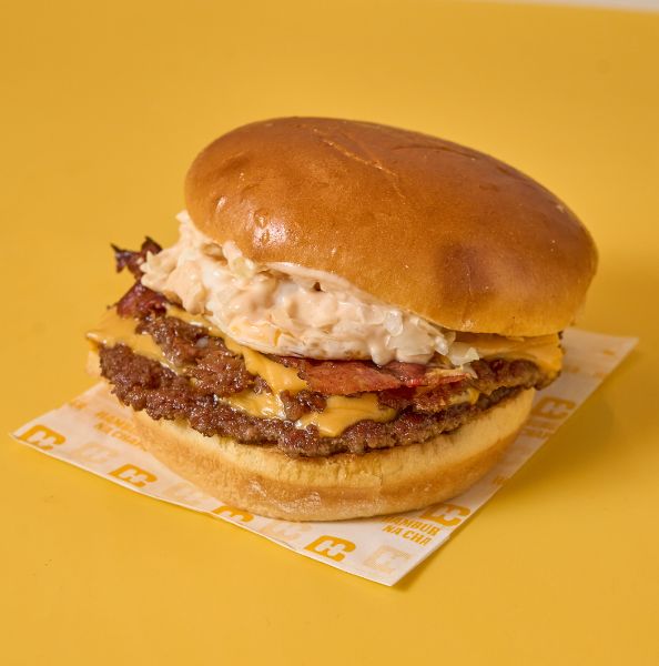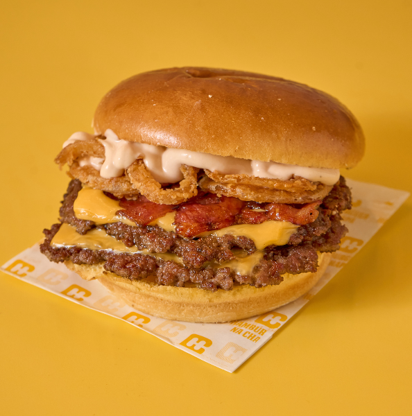 Pão brioche, double smashburger (apróx. 170gr), bacon grelhado, queijo cheddar, tiras de cebola