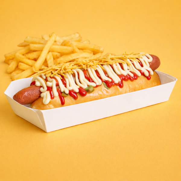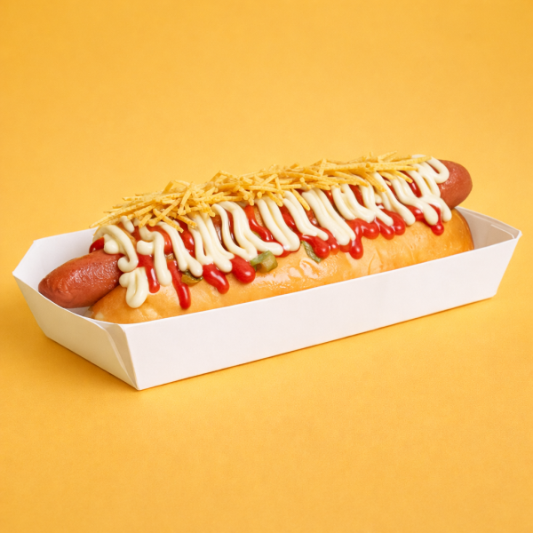 Pão brioche, salsicha americana, vinagrete, ketchup, maionese e batata palha.