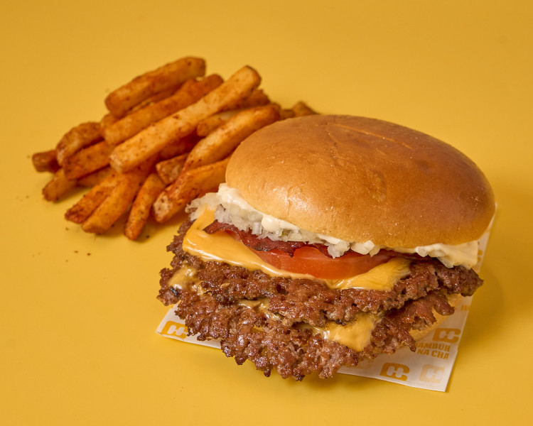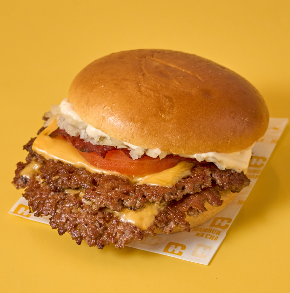 Pão brioche, duplo smashburger apróx. 180gr, queijo cheddar, tomate, cebola fresca , bacon