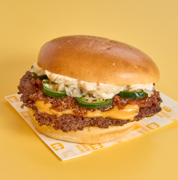 Pão brioche, hambúrguer de vaca artesanal, queijo cheddar, jalapeños, bacon e maionese picante.