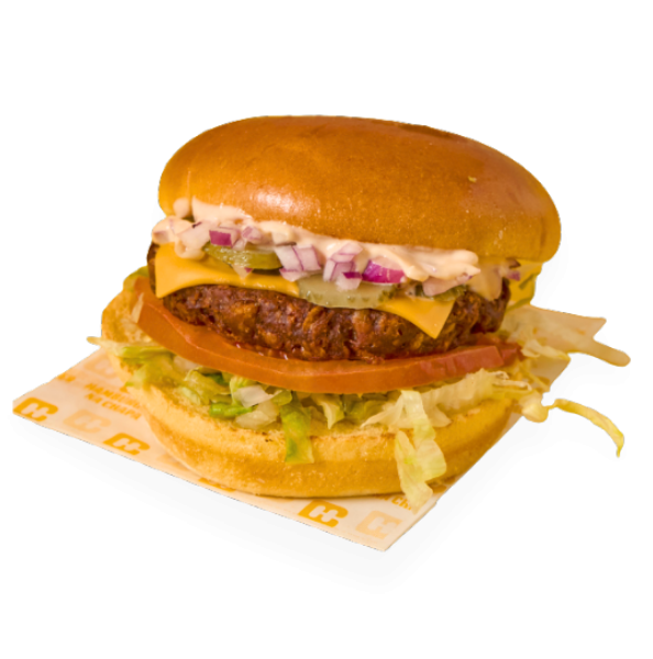 Brioche bun, veggie patty, cheddar, red onion, lettuce, tomato, pickles e molho